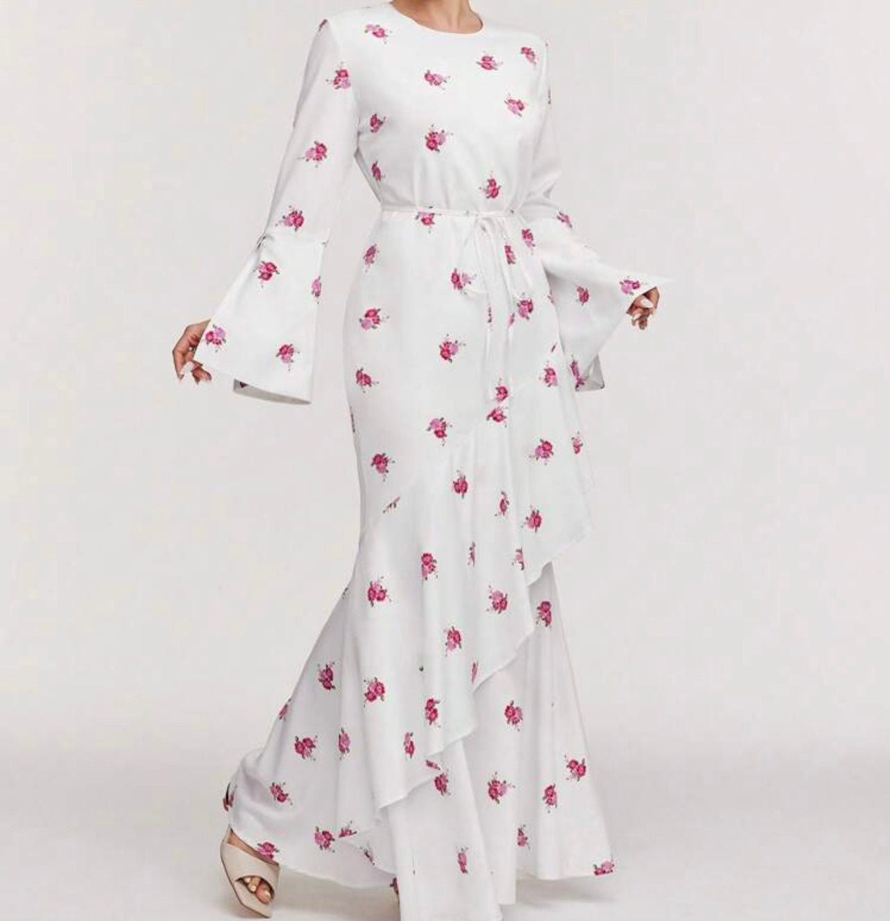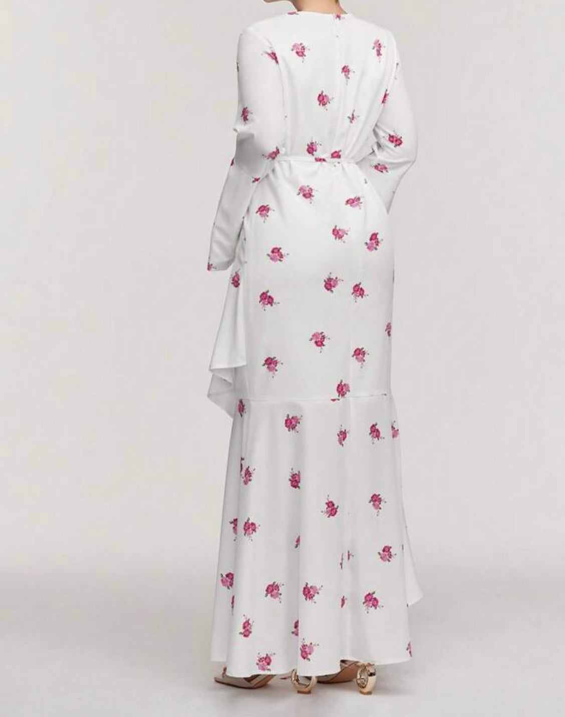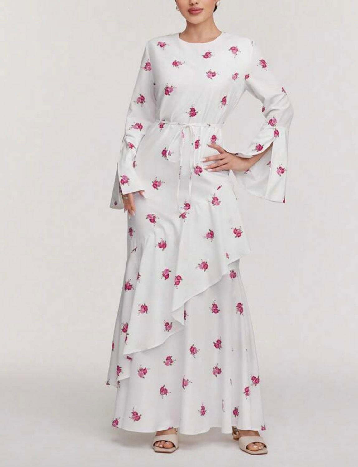 Deze charmante maxi jurk straalt vrouwelijkheid en elegantie uit met haar frisse witte kleur en subtiele roze bloemenprint. De jurk is voorzien van een ronde halslijn, lange mouwen met een stijlvolle split en een strikceintuur in de taille voor een flatterende pasvorm. De asymmetrische volant aan de onderzijde geeft een speelse en verfijnde touch. Perfect voor zomerse gelegenheden, feestjes of een chique diner. Combineer met sandalen of hakken voor een complete look.