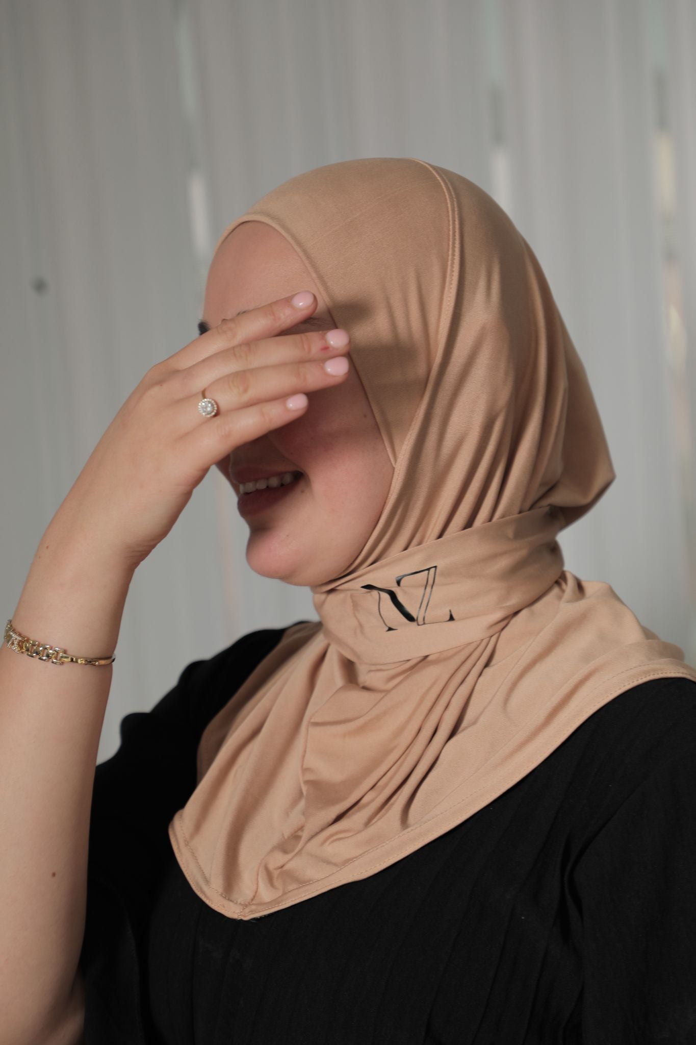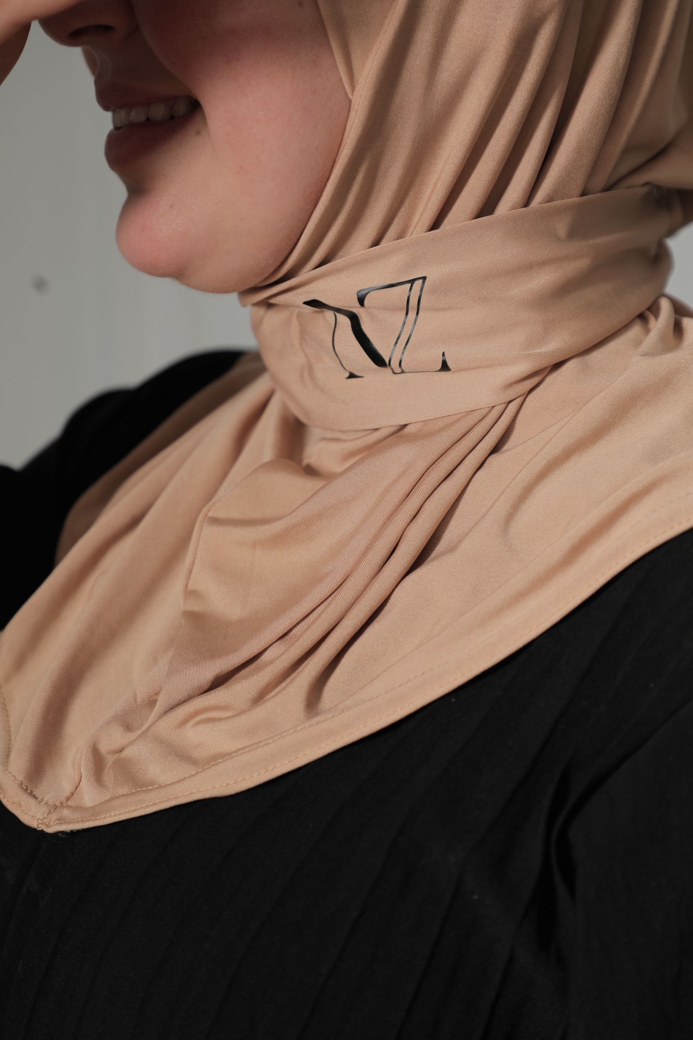 Een opvallend detail is het ingewerkte “NZ”-logo onderaan de halslijn, wat de hijab een eigentijdse, merkgerichte uitstraling geeft. De afwerking is netjes met een licht afgeronde zoomrand, wat zorgt voor een verzorgde look bij dagelijks én formeel gebruik.