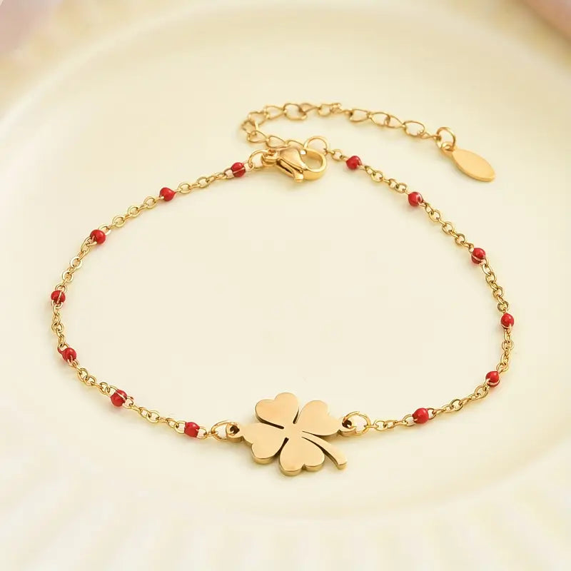 Deze stijlvolle armband is gemaakt van hoogwaardig stainless steel en is voorzien van subtiele rode kraaltjes die de fijne schakelketting sieren. In het midden prijkt een elegant klavertje vier, symbool voor geluk en positiviteit. Dankzij het verstelbare sluitinkje is de armband geschikt voor verschillende polsmaten. Roestvrij, kleurvast en perfect voor dagelijks gebruik of als betekenisvol cadeau.